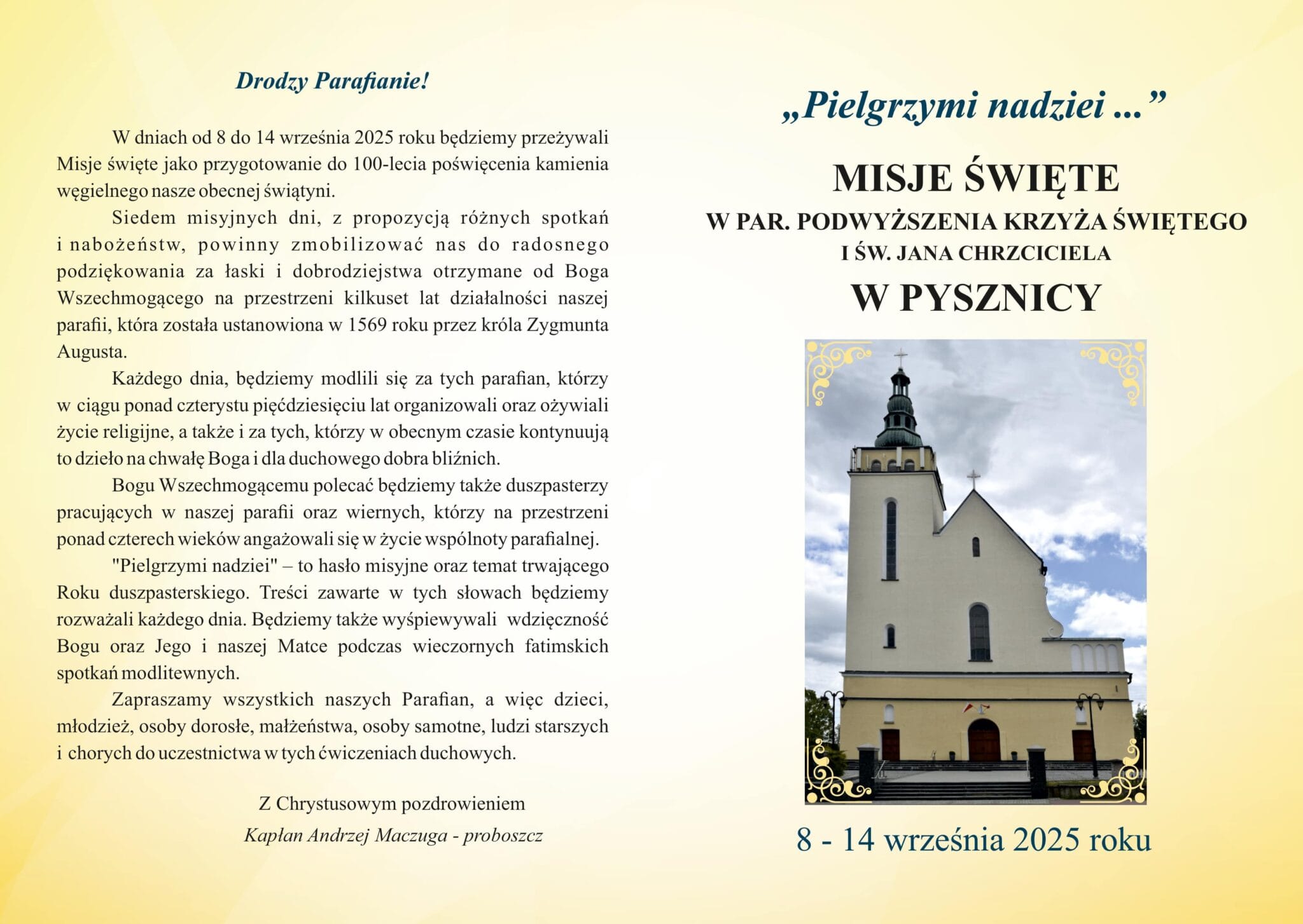 Plan wizytacji w parafii Pysznica – 13.04.2026 r.Godz. 13.20 – Przyjazd pod plebanię Godz. 13.30 – Wizyta w...